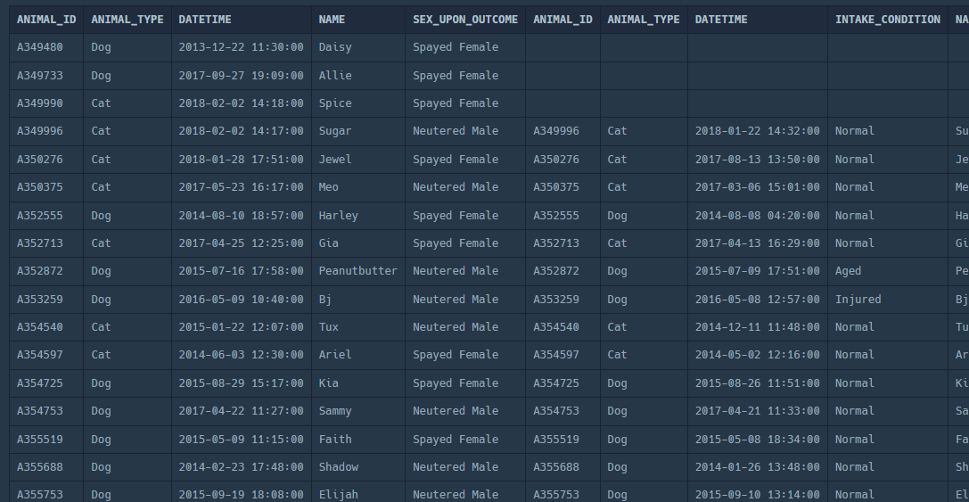 SELECT OUTS.ANIMAL_ID, OUTS.NAME